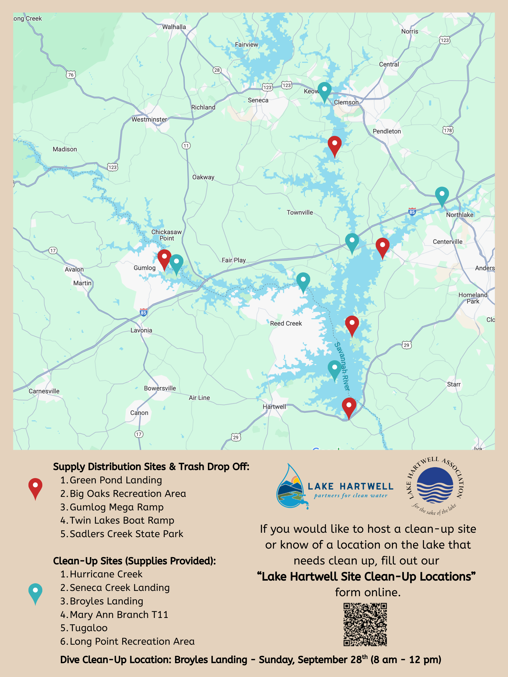 *Note that SUPPLY DISTRIBUTION SITES (in red) will have SUPPLIES ONLY and do not need active clean-ups. You will go to these sites to grab supplies from a site captain and clean up at your own location around the lake. CLEAN-UP SITES (in blue) need active clean-ups at that location.